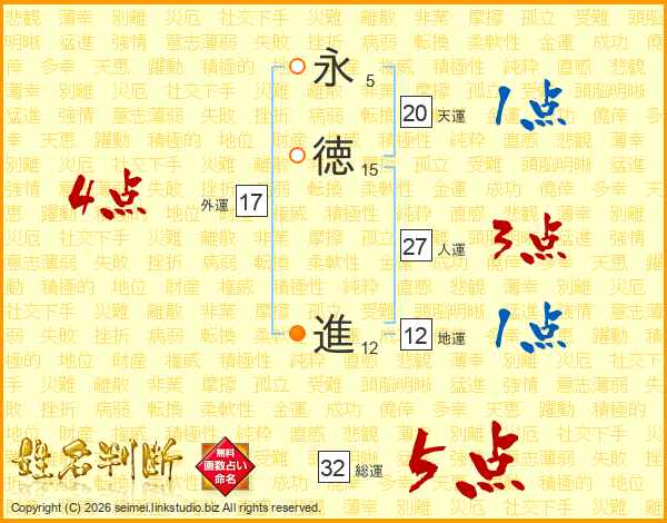 生活面を象徴する運勢です。外部から受ける影響力を表し、結婚運、家庭運や職場、環境への順応性を表します。総運から人運を引いた画数。姓や名が1文字の場合を除く。