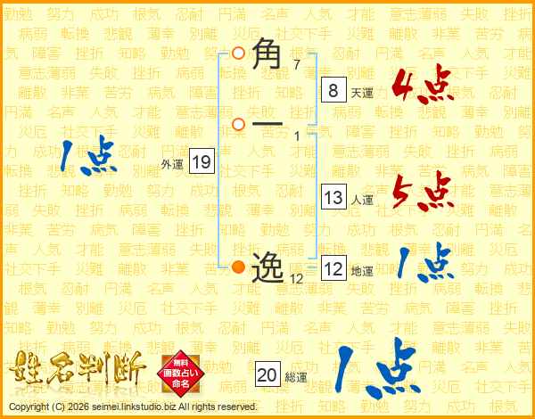 生活面を象徴する運勢です。外部から受ける影響力を表し、結婚運、家庭運や職場、環境への順応性を表します。総運から人運を引いた画数。姓や名が1文字の場合を除く。