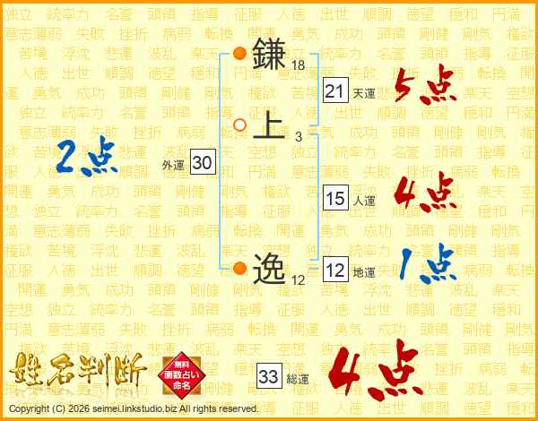 鎌上逸さんの総運は33画の4点!
