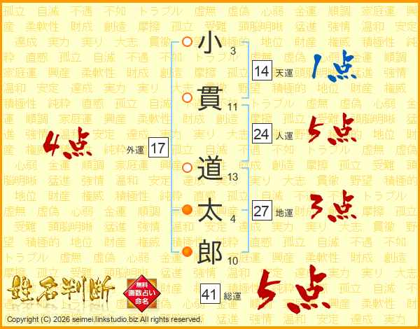 小(3画)貫(11画) 道(13画)太(4画)郎(10画)