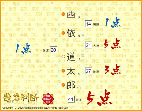西(6画)依(8画) 道(13画)太(4画)郎(10画)