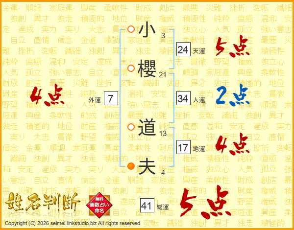 小(3画)櫻(21画) 道(13画)夫(4画)
