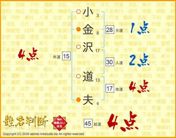 小(3画)金(8画)沢(17画) 道(13画)夫(4画)