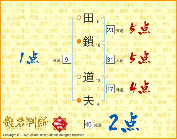 田(5画)鎖(18画) 道(13画)夫(4画)