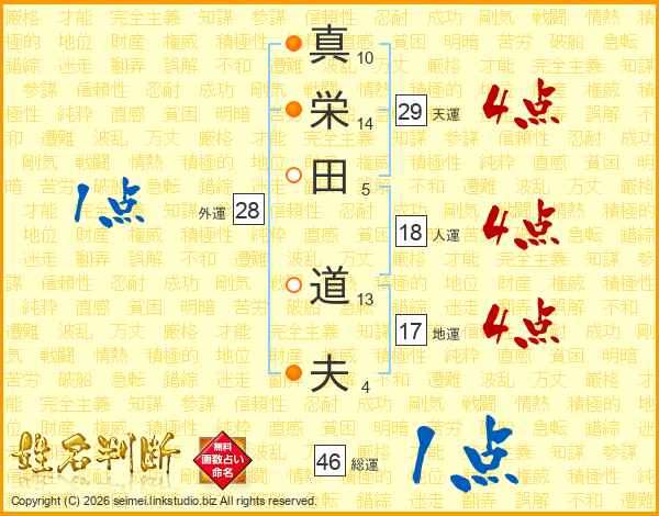 真(10画)栄(14画)田(5画) 道(13画)夫(4画)
