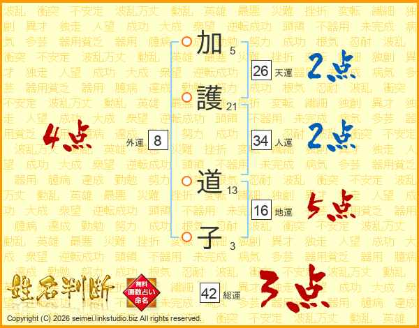 あなたの人生を表す1番重要な運勢です。生涯を通じて影響する総合運となり、主に50歳以降の晩年期に影響を及ぼします。苗字と名前の合計画数。