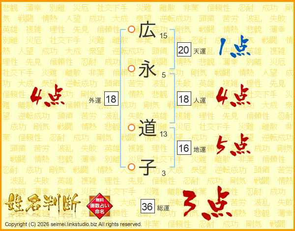 広(15画)永(5画) 道(13画)子(3画)