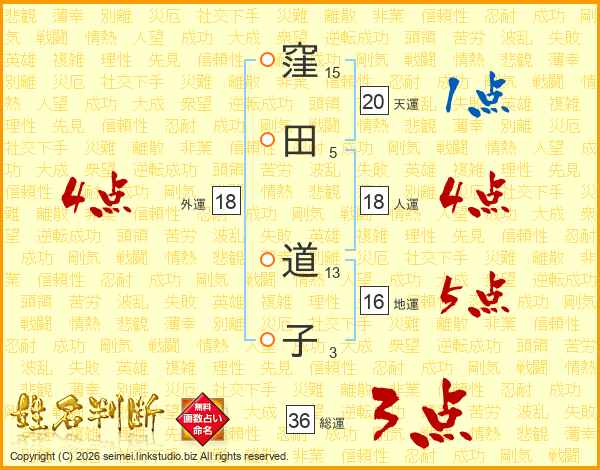 窪(15画)田(5画) 道(13画)子(3画)