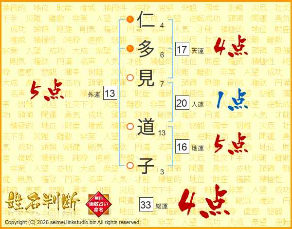 仁多見道子さんの総運は33画の4点!