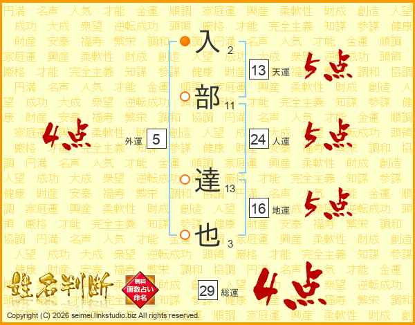 入部達也さんの人運は24画の5点!