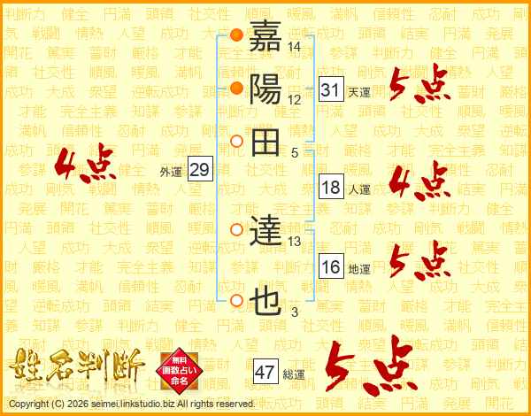 嘉陽田達也さんの総運は47画の5点!