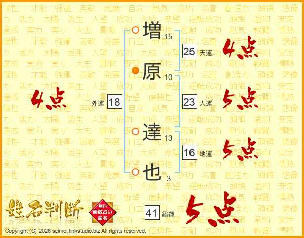 家系が持つ宿命的な運勢を表します。祖先から受け継いだ苗字ですので自分の力が及びません。家柄を象徴します。苗字の合計画数。