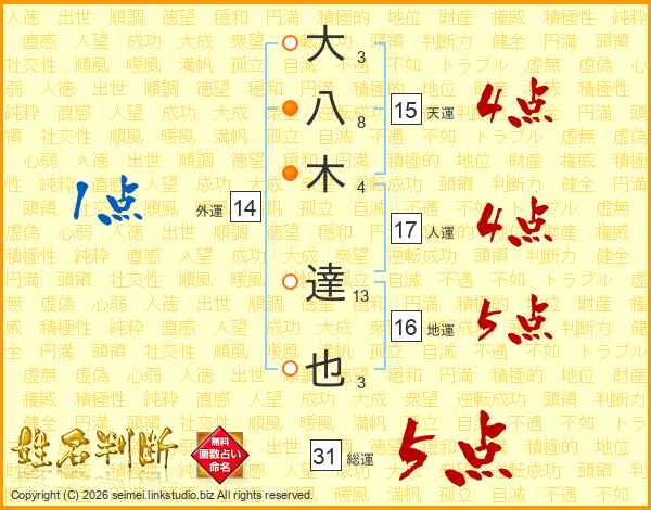大(3画)八(8画)木(4画) 達(13画)也(3画)