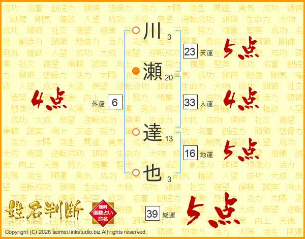 川瀬達也さんの人運は33画の4点!