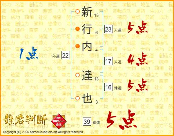新行内達也さんの総運は39画の5点!
