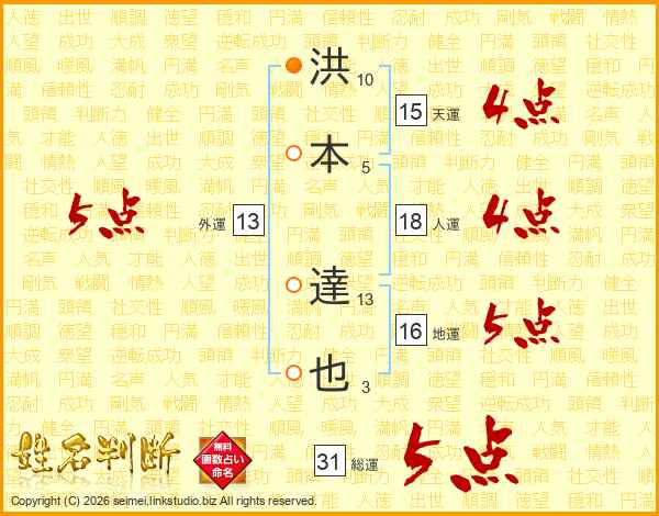 洪本達也さんの総運は31画の5点!