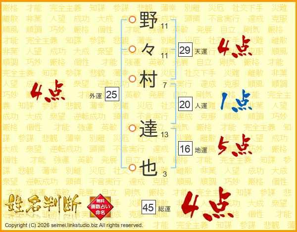 野々村達也さんの総運は45画の4点!