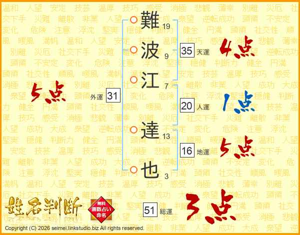 難(19画)波(9画)江(7画) 達(13画)也(3画)