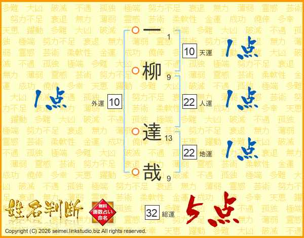 生活面を象徴する運勢です。外部から受ける影響力を表し、結婚運、家庭運や職場、環境への順応性を表します。総運から人運を引いた画数。姓や名が1文字の場合を除く。