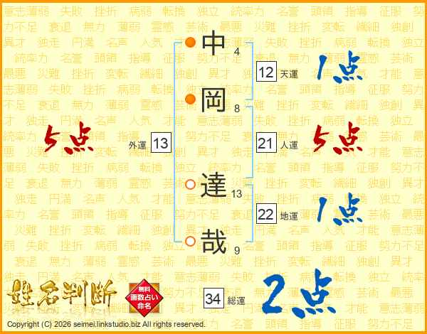 生活面を象徴する運勢です。外部から受ける影響力を表し、結婚運、家庭運や職場、環境への順応性を表します。総運から人運を引いた画数。姓や名が1文字の場合を除く。