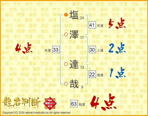 塩澤達哉さんの総運は63画の4点!