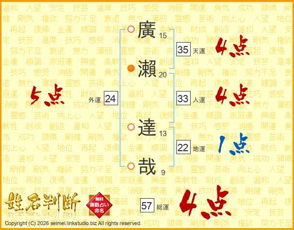 廣(15画)瀨(20画) 達(13画)哉(9画)