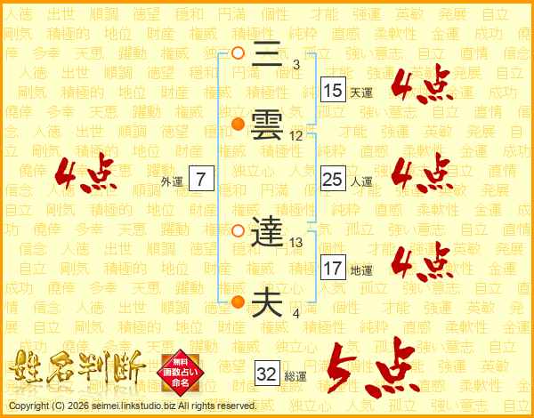 生活面を象徴する運勢です。外部から受ける影響力を表し、結婚運、家庭運や職場、環境への順応性を表します。総運から人運を引いた画数。姓や名が1文字の場合を除く。