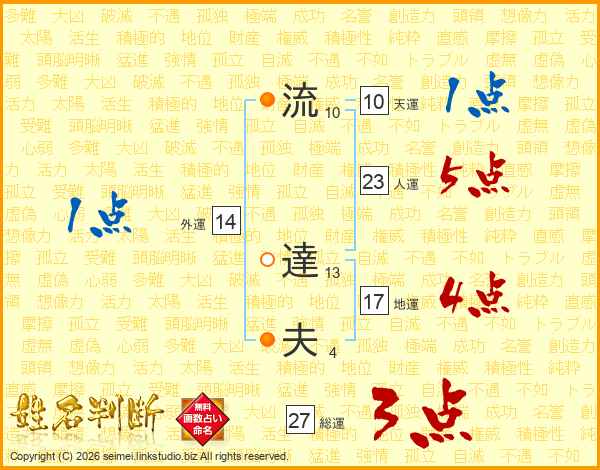 生活面を象徴する運勢です。外部から受ける影響力を表し、結婚運、家庭運や職場、環境への順応性を表します。総運から人運を引いた画数。姓や名が1文字の場合を除く。