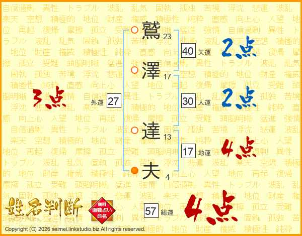 鷲(23画)澤(17画) 達(13画)夫(4画)