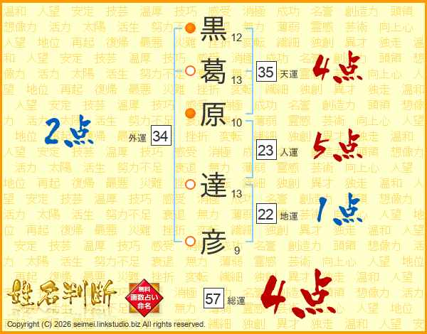 黒(12画)葛(13画)原(10画) 達(13画)彦(9画)