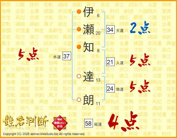 伊瀬知達朗さんの総運は58画の4点!