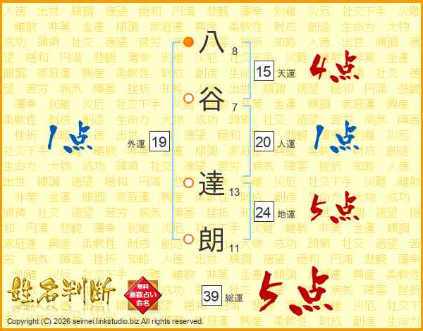 八谷達朗さんの総運は39画の5点!