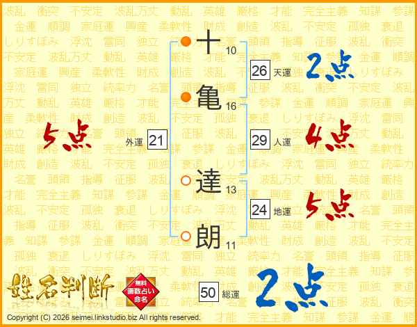 十(10画)亀(16画) 達(13画)朗(11画)