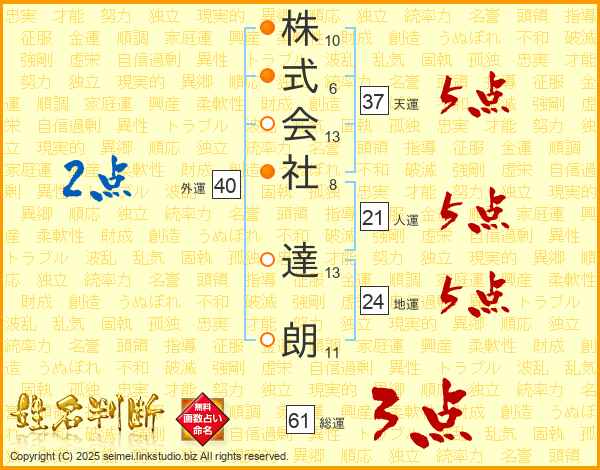 株(10画)式(6画)会(13画)社(8画) 達(13画)朗(11画)