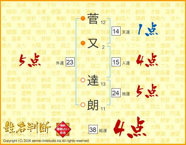 菅又達朗さんの総運は38画の4点!