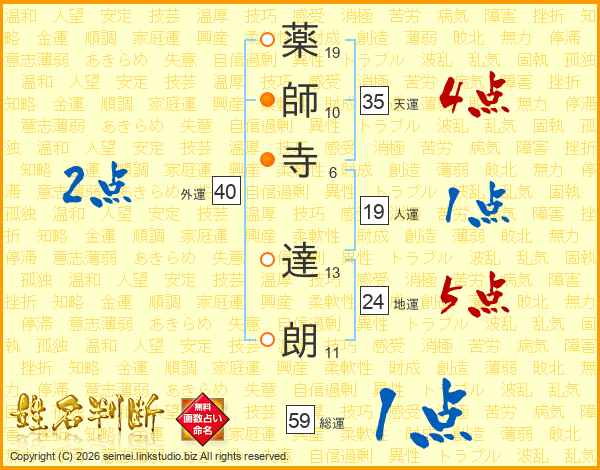 薬(19画)師(10画)寺(6画) 達(13画)朗(11画)