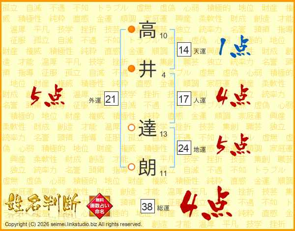 生活面を象徴する運勢です。外部から受ける影響力を表し、結婚運、家庭運や職場、環境への順応性を表します。総運から人運を引いた画数。姓や名が1文字の場合を除く。
