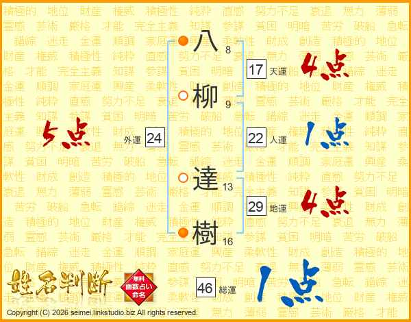 八柳達樹さんの総運は46画の1点!