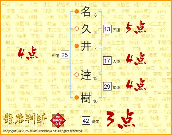 名(6画)久(3画)井(4画) 達(13画)樹(16画)