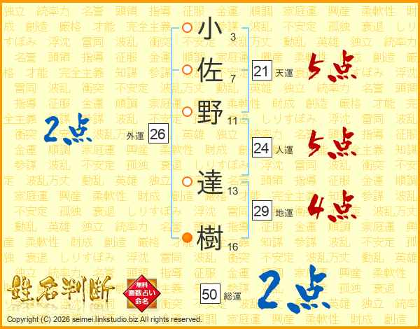 小(3画)佐(7画)野(11画) 達(13画)樹(16画)