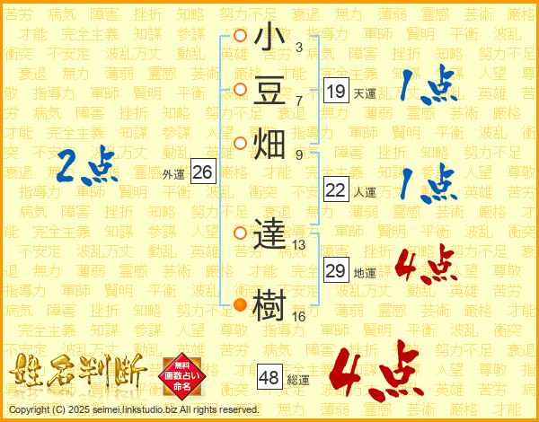 生活面を象徴する運勢です。外部から受ける影響力を表し、結婚運、家庭運や職場、環境への順応性を表します。総運から人運を引いた画数。姓や名が1文字の場合を除く。