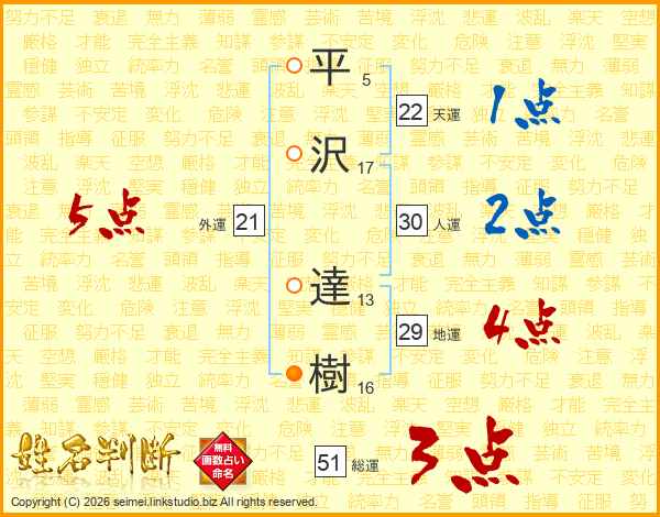 あなたの人生を表す1番重要な運勢です。生涯を通じて影響する総合運となり、主に50歳以降の晩年期に影響を及ぼします。苗字と名前の合計画数。
