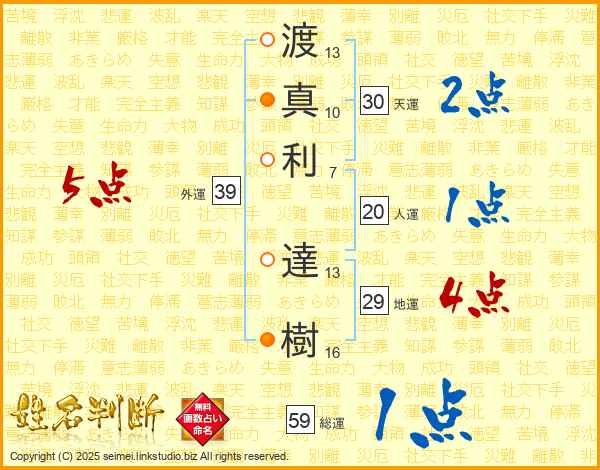 渡(13画)真(10画)利(7画) 達(13画)樹(16画)