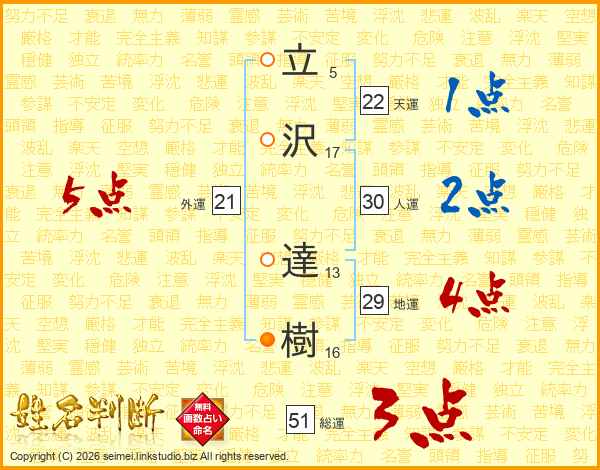 立(5画)沢(17画) 達(13画)樹(16画)
