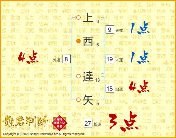 生活面を象徴する運勢です。外部から受ける影響力を表し、結婚運、家庭運や職場、環境への順応性を表します。総運から人運を引いた画数。姓や名が1文字の場合を除く。