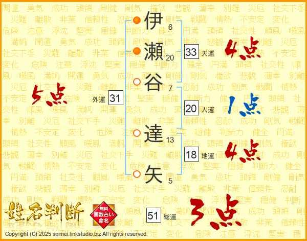 伊(6画)瀬(20画)谷(7画) 達(13画)矢(5画)