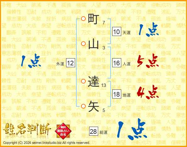 あなたの人生を表す1番重要な運勢です。生涯を通じて影響する総合運となり、主に50歳以降の晩年期に影響を及ぼします。苗字と名前の合計画数。