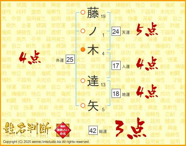 藤(19画)ノ(1画)木(4画) 達(13画)矢(5画)