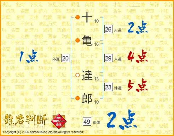 あなたの人生を表す1番重要な運勢です。生涯を通じて影響する総合運となり、主に50歳以降の晩年期に影響を及ぼします。苗字と名前の合計画数。