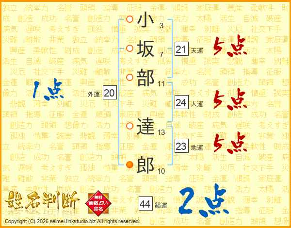 小(3画)坂(7画)部(11画) 達(13画)郎(10画)